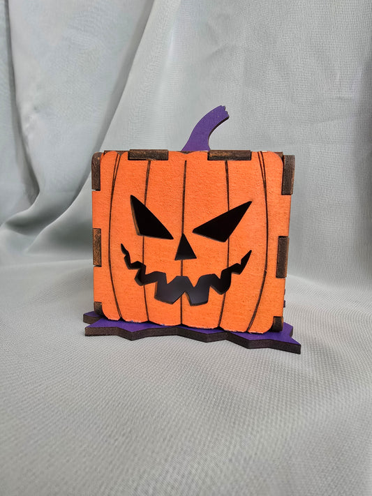 Halloween 3D Jack-O-Lantern Pumpkin, Laser Cut Plywood, Painted, w/ Tea Candle