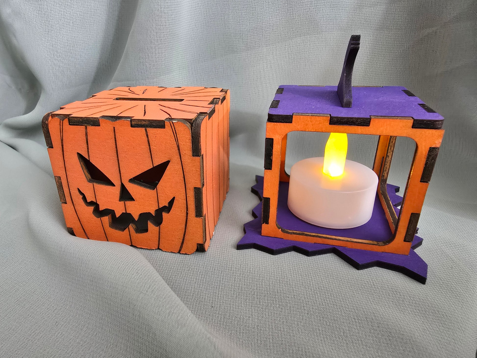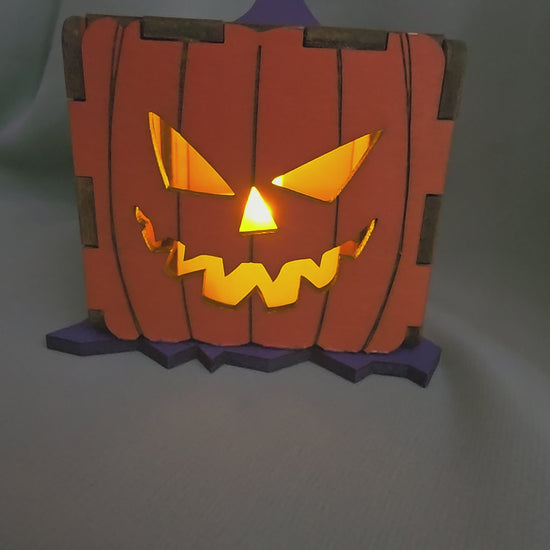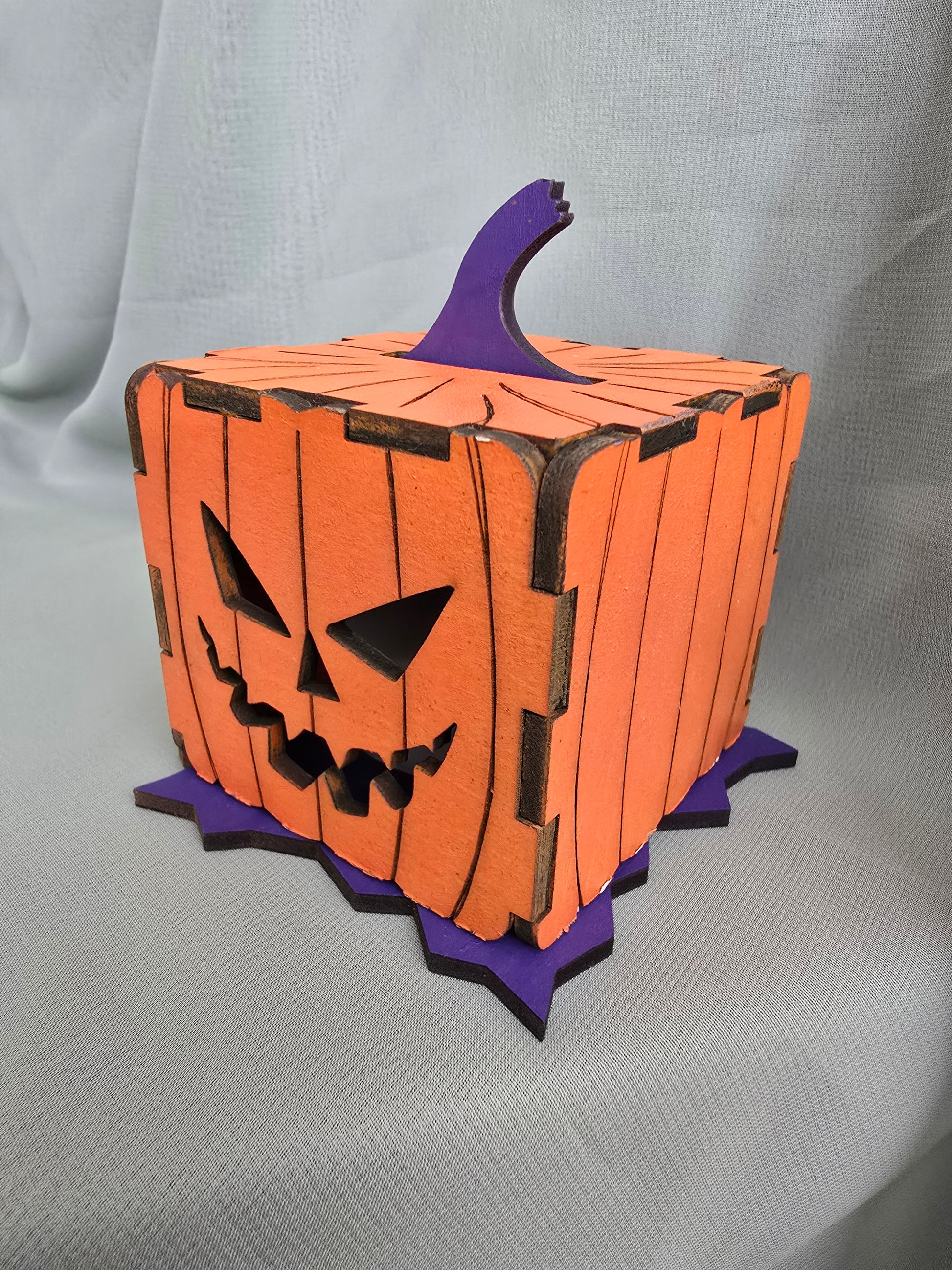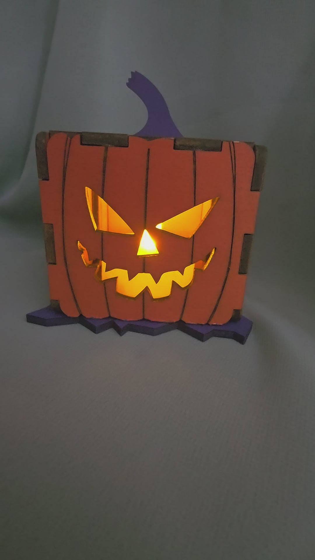 This is a 3D laser cut 2.5” x 2.5” square-shaped plywood Jack-O-Lantern Pumpkin perfect for Halloween decoration. Painted in a Halloween seasonal theme. This is an original and unique collectible item which will add a festive mood to your Halloween. Flickering warm-colored battery operated tea light is included. Different sizes, colors and shapes available up on request.